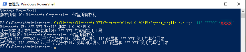 • 然后运行如下命令(注意命令中的IIS APPPOOL\XXXX为上述错误中括号中的内容):